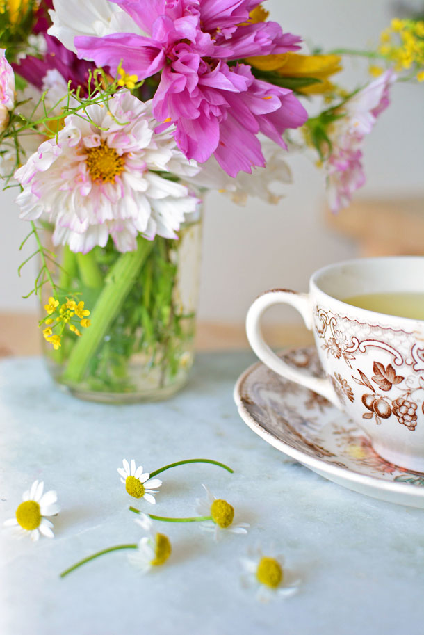 Once you’ve selected a pot, you’ll want to harvest your herbs. For the chamomile flowers, it’s ideal to use them the same day they are harvested, as the delicate petals have a short shelf life. Otherwise, they can last a couple of days in the refrigerator in a plastic bag with a lightly dampened paper towel. To prepare the chamomile for use, pop the head of the flower off the stem. They can even be harvested this way, so that they are immediately ready for use. For the mint, select a small sprig about the size of a quarter off the tender top of the plant. I selected a variety of mint called apple mint because fresh chamomile also has apple undertones, so they complement each other perfectly. Peppermint is also delicious.